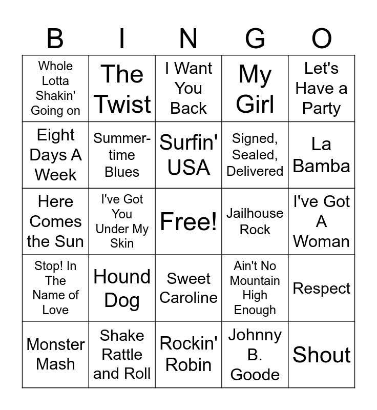 This bingo card has a free space and 29 words: Monster Mash, Jailhouse Rock, I've Got You Under My Skin, Tutti Frutti, Whole Lotta Shakin' Going on, I Want You Back, Summer-time Blues, Hound Dog, Jailhouse Rock, Shake Rattle and Roll, I've Got A Woman, Shout, Rockin' Robin, Johnny B. Goode, La Bamba, You Don't Own Me, Sweet Caroline, Stop! In The Name of Love, Let's Have a Party, Here Comes the Sun, Ain't No Mountain High Enough, A Natural Woman, Signed, Sealed, Delivered, Eight Days A Week, My Girl, The Twist, Respect, Surfin' USA and Heartbreak Hotel.
