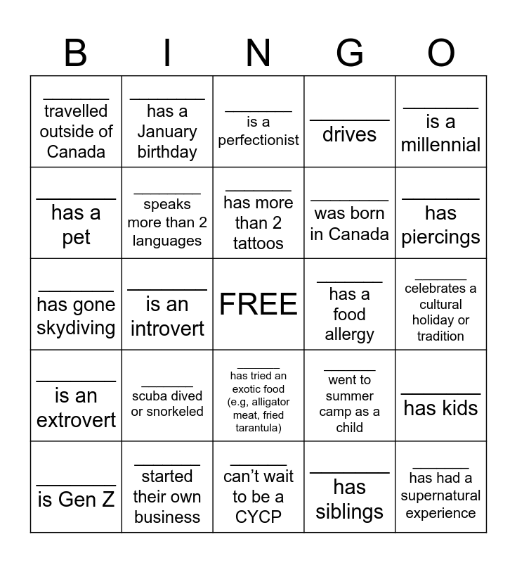 This bingo card has a free space and 24 words: _______ scuba dived or snorkeled, _______ started their own business, _______ has more than 2 tattoos, _______ is Gen Z, _______ is a millennial, _______ travelled outside of Canada, _______ has a pet, ________ has a January birthday, _______ has a food allergy, _______ has tried an exotic food (e.g, alligator meat, fried tarantula), ________ was born in Canada, _______ has gone skydiving, _______ went to summer camp as a child, _______ has kids, ________ speaks more than 2 languages, _______ has siblings, _______ celebrates a cultural holiday or tradition, ________ is a perfectionist, _______ has piercings, _______ is an introvert, _______ has had a supernatural experience, _______ is an extrovert, _______ drives and ______ can’t wait to be a CYCP.