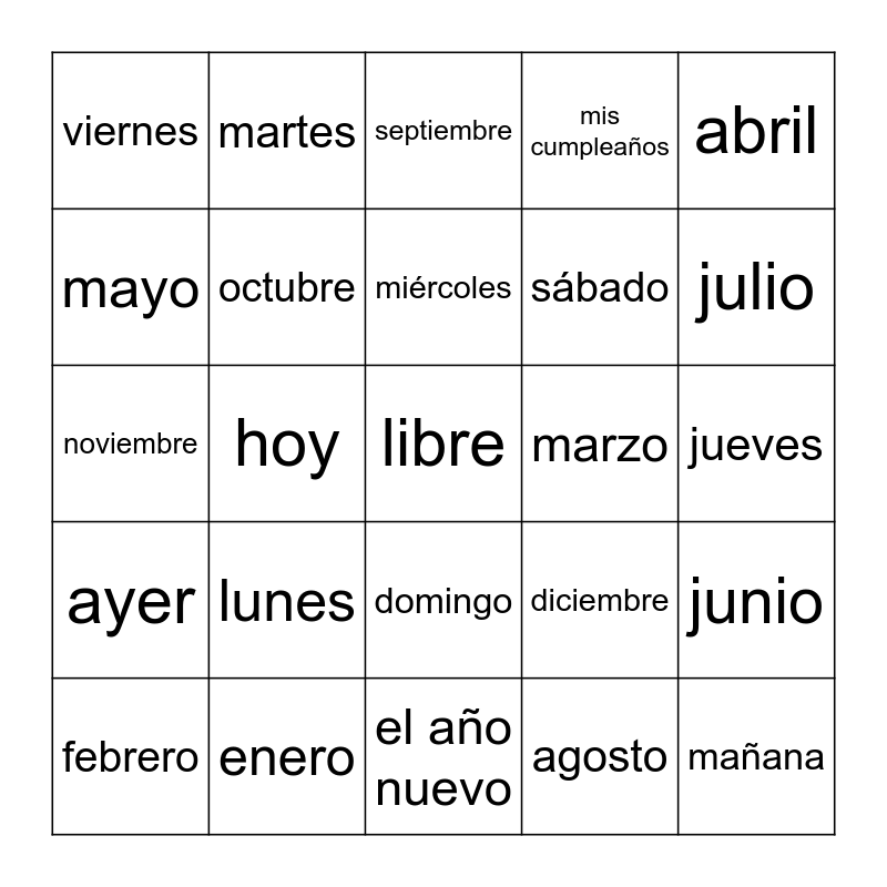 This bingo card has a free space and 24 words: lunes, enero, miércoles, febrero, abril, viernes, mayo, martes, marzo, domingo, sábado, noviembre, diciembre, junio, octubre, agosto, jueves, septiembre, julio, hoy, mañana, ayer, mis cumpleaños and el año nuevo.