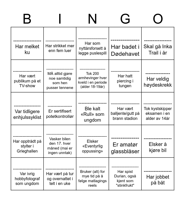 This bingo card has 25 words: --------------------- Vasker bilen den 17. hver måned (mai er ingen unntak), --------------------- Bruker (alt) for mye tid på å følge matlagings reels, --------------------- Tok 200 armhevinger hver kveld i en periode (alder 18-19år), --------------------- Var ivrig hobbyfotograf som ungdom, ---------------- Skal gå Inka Trail i år, ----------------- Har melket ku, --------------------- Har vært publikum på et TV-show, --------------------- Har strikket mer enn fem luer, --------------------- Har vært balljente/gutt på brann stadion, --------------------- Elsker «Eventyrlig oppussing», --------------------- Har hatt piercing i tungen, ----------------- Var tidligere enhjulssyklist, --------------- Er amatør glassblåser, ----------------- Elsker å kjøre bil, --------------------- MÅ alltid gjøre noe samtidig som hen pusser tennene, ----------------- Har jobbet på båt, --------------------- Tok kystskipper eksamen i en alder av 14år, --------------------- Har som nyttårsforsett å legge puslespill, --------------- Har veldig høydeskrekk, ----------------- Er sertifisert potetkontrollør, ------------------ Ble kalt «Rull» som ungdom, --------------------- Har vært på tur og overnattet i telt i en uke, --------------------- Har opptrådt på stylter i Grieghallen, --------------- Har badet i Dødehavet and --------------------- Har spist Durian, også kjent som "stinkfrukt".
