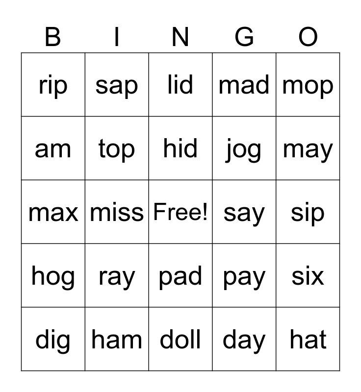 This bingo card has a free space and 24 words: ray, ham, hid, dig, mop, rip, am, sap, say, pad, jog, max, pay, six, top, day, sip, lid, may, miss, hat, hog, mad and doll.