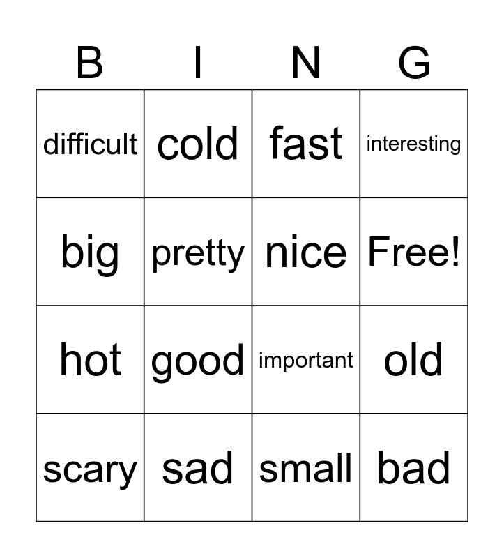This bingo card has 18 words: good, bad, fast, difficult, important, interesting, scary, cold, Free!, hot, small, big, old, pretty, nice, hungry, sad and tasty.