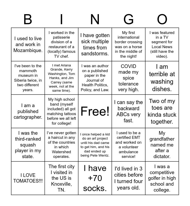 This bingo card has a free space and 57 words: I used to climb wind turbines for a job., I LOVE TOMATOES!!!, I see Will Ferrel in person on a semi-regular basis., I used to live and work in Mozambique., I have +70 socks., My left leg is 8MM longer than my right., I met Ariana Grande, Kerry Washington, Tom Hanks, and Jim Carrey (same week, not at the same time)., I want to open an ice cream shop when I retire., COVID made my spice tolerance very high., I was once a professional baker., My first international border crossing was on a horse in the middle of the night!, I spent a lot of hours playing Counter Strike in middle school., I have an irrational fear of pretty much all animals., I ran reggaeton dance classes in Switzerland., I was the third-ranked squash player in my state., I cooked cicadas for my friends when a big cicada brood hatched in 2021., I was featured in a TV segment for Local News (still have the video)., My high school band (myself included) all got matching tattoos before we all left for college!, I took a dance class taught by Britney Spears., I was a competitive golfer in high school and college., I can say the backward ABCs very fast., I was a practicing lawyer, but decided to pivot., I used to be a certified EMT and worked on a volunteer ambulance service!, I have gotten sick multiple times from sandstorms., I have a secret obsession with The Minions., I was an author on a published paper in the Journal of Health Politics, Policy, and Law., During COVID, I had a side hustle of making really pretty chocolate-covered strawberries, breakable chocolate hearts, hot cocoa bombs, and some other chocolate treats. I miss it., I have every type of brother., I am terrible at washing dishes., I had a short-lived career on Disney magazine., My house has a hairless cat named Eloise lol., I don't drink coffee., I cut my finger (part of it off) with a door when I was young, but they put it back on., I wrote a 5000-word academic essay on the Broadway musical Hamilton, presented the abstract in rap format, and won an award for it., Two of my toes are kinda stuck together., I've been to the mammoth museum in Siberia twice, in two different years., I used to make biochar in middle school., I am a published cartographer., I have never been to Taco Bell., I was the third-ranked squash player in my state., I worked in the patisserie division of a restaurant of a (locally) famous TV chef., I once helped a kid do an art project until his dad came to get him, and his dad ended up being Pete Wentz., I pickled veggies for a hobby!, Anytime I have to sneeze, I will sneeze at least 3 times in a row (sometimes up to 10)., My death row meal is the Cheesecake Factory's fettuccine Alfredo., I took Mandarin Chinese for 4 years in high school—my favorite word (and one of the few I can remember) is the Chinese word for hamburger, Hambaobao., I’ve never gotten a haircut in any of the countries in which Watershed operates., The first city I visited in the US is Knoxville, TN., I have a dream of becoming a park ranger., I’ve walked through a civil war., I spent 10 days in silent meditation., I'd lived in 3 cities before I turned four years old., I am a huge Grateful Dead fan and have been to 6 Dead and Company concerts., My username for online chess is FortySippa., When I was little, my dream job was to be a bread critic., My grandfather named me after a dictator. and I bought most of my pants on Reddit..