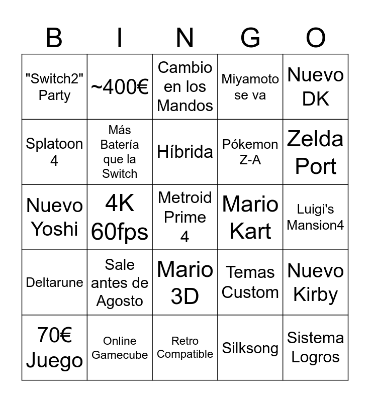 This bingo card has 25 words: Deltarune, Online Gamecube, Metroid Prime 4, Silksong, Nuevo DK, "Switch2" Party, ~400€, Cambio en los Mandos, Mario Kart, Nuevo Kirby, Splatoon 4, Más Batería que la Switch, Retro Compatible, Temas Custom, Zelda Port, 70€ Juego, 4K 60fps, Híbrida, Pókemon Z-A, Luigi's Mansion4, Nuevo Yoshi, Sale antes de Agosto, Mario 3D, Miyamoto se va and Sistema Logros.