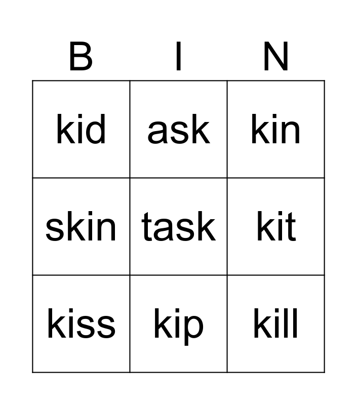 This bingo card has a free space and 8 words: kit, kin, ask, kiss, kid, kill, skin and kip.