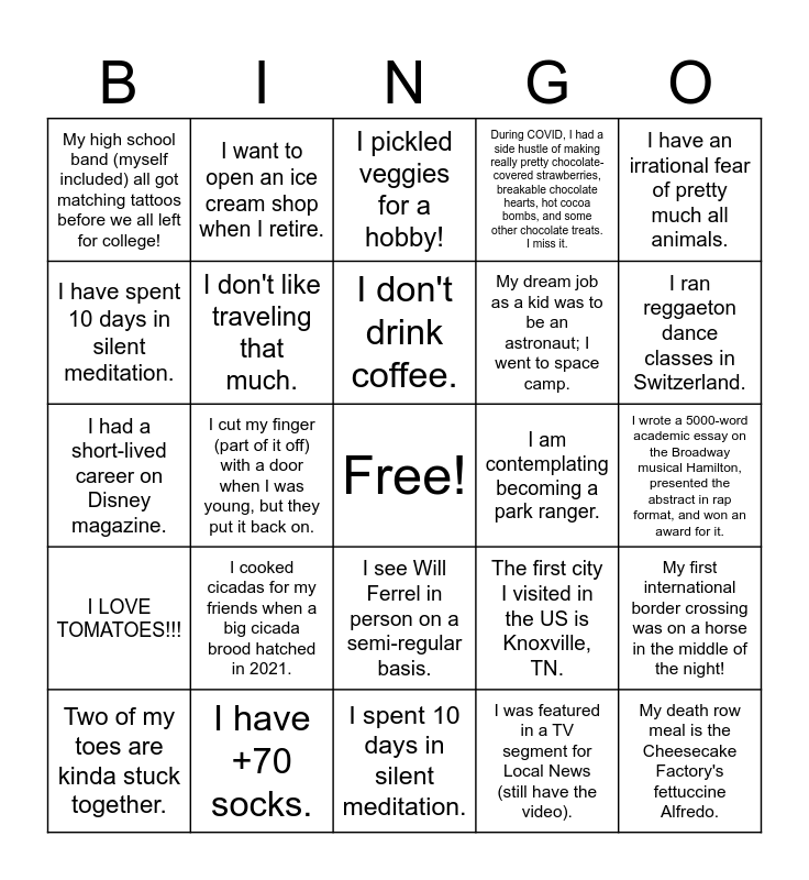 This bingo card has a free space and 60 words: I used to climb wind turbines for a job., I have +70 socks., I cooked cicadas for my friends when a big cicada brood hatched in 2021., I LOVE TOMATOES!!!, I was featured in a TV segment for Local News (still have the video)., I see Will Ferrel in person on a semi-regular basis., I don't like traveling that much., I met Ariana Grande, Kerry Washington, Tom Hanks, and Jim Carrey (same week, not at the same time)., My dream job as a kid was to be an astronaut; I went to space camp., I have every type of brother., During COVID, I had a side hustle of making really pretty chocolate-covered strawberries, breakable chocolate hearts, hot cocoa bombs, and some other chocolate treats. I miss it., I have gotten sick multiple times from sand storms., I have spent 10 days in silent meditation., I took a dance class taught by Britney Spears., I spent a lot of hours playing Counter Strike in middle school., My high school band (myself included) all got matching tattoos before we all left for college!, My death row meal is the Cheesecake Factory's fettuccine Alfredo., I have an irrational fear of pretty much all animals., I was a practicing lawyer, but decided to pivot., I don't drink coffee., I am contemplating becoming a park ranger., I pickled veggies for a hobby!, Two of my toes are kinda stuck together., My first international border crossing was on a horse in the middle of the night!, I was the third-ranked squash player in my state., I have never been to Taco Bell., I am terrible at washing dishes., I have a secret obsession with The Minions., I ran reggaeton dance classes in Switzerland., I took Mandarin Chinese for 4 years in high school—my favorite word (and one of the few that I can remember) is the Chinese word for hamburger, Hambaobao., I used to live and work in Mozambique., I worked in the patisserie division of a restaurant of a (locally) famous TV chef., I am a huge Grateful Dead fan and have been to 6 Dead and Company concerts., My house has a hairless cat named Eloise lol., I want to open an ice cream shop when I retire., I bought most of my pants on Reddit., My left leg is 8MM longer than my right., I cut my finger (part of it off) with a door when I was young, but they put it back on., I used to make biochar in middle school., I had a short-lived career on Disney magazine., COVID made my spice tolerance very high., I cooked cicadas for my friends when a big cicada brood hatched in 2021., I wrote a 5000-word academic essay on the Broadway musical Hamilton, presented the abstract in rap format, and won an award for it., I once helped a kid do an art project until his dad came to get him, and his dad ended up being Pete Wentz., The first city I visited in the US is Knoxville, TN., I have +70 socks., I LOVE TOMATOES!!!, I don't like traveling that much., I was once a professional baker., I see Will Ferrel in person on a semi-regular basis., I spent 10 days in silent meditation., I was a competitive golfer in high school and college., My dream job as a kid was to be a bread critic., I am a published cartographer., I was an author on a published paper in the Journal of Health Politics, Policy, and Law., I’ve walked through a civil war., I have spent 10 days in silent meditation., Anytime I have to sneeze, I will sneeze at least 3 times in a row (sometimes up to 10)., I met Ariana Grande, Kerry Washington, Tom Hanks, and Jim Carrey (same week, not at the same time). and I used to be a certified EMT and worked on a volunteer ambulance service!.