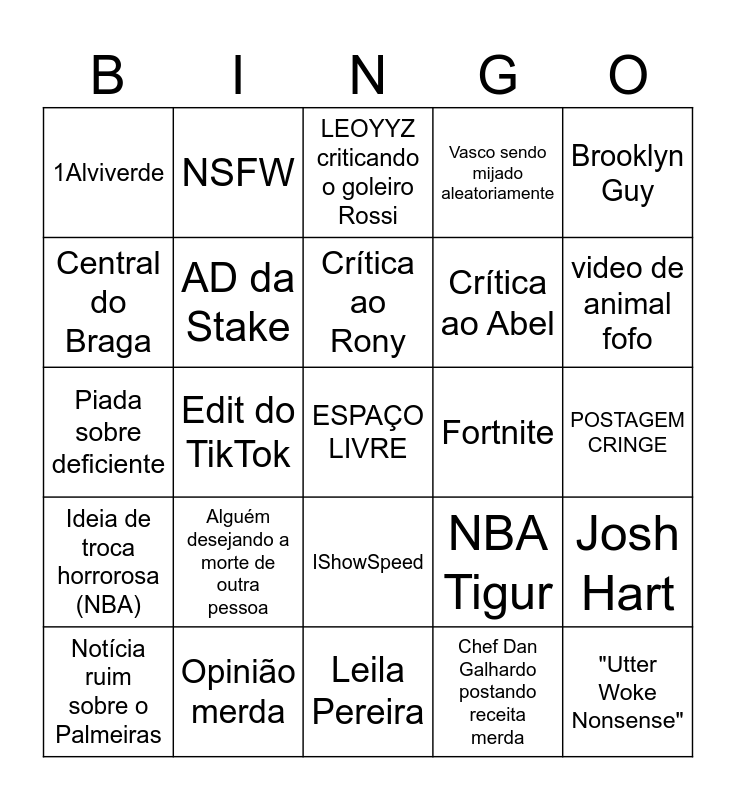 This bingo card has a free space and 24 words: Alguém desejando a morte de outra pessoa, Opinião merda, Crítica ao Rony, Notícia ruim sobre o Palmeiras, Brooklyn Guy, 1Alviverde, Central do Braga, NSFW, Fortnite, IShowSpeed, Crítica ao Abel, Piada sobre deficiente, NBA Tigur, Josh Hart, AD da Stake, Chef Dan Galhardo postando receita merda, POSTAGEM CRINGE, LEOYYZ criticando o goleiro Rossi, video de animal fofo, Edit do TikTok, "Utter Woke Nonsense", Ideia de troca horrorosa (NBA), Vasco sendo mijado aleatoriamente and Leila Pereira.