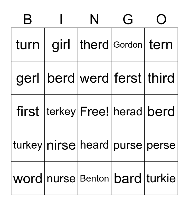 This bingo card has a free space and 24 words: nirse, nurse, werd, word, tern, turn, gerl, girl, herad, heard, ferst, first, purse, perse, berd, bard, berd, therd, third, terkey, turkie, turkey, Gordon and Benton.