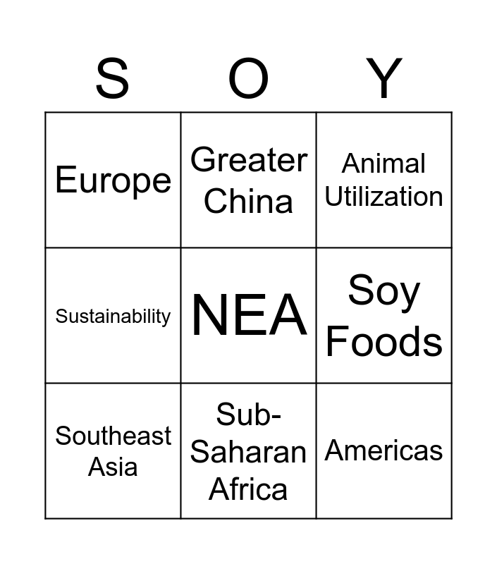 This bingo card has a free space and 13 words: South Asia, MENA, Southeast Asia, Greater China, Sustainability, Americas, Aqua, Oil, Sub-Saharan Africa, Europe, Soy Foods, Animal Utilization and Soy Excellence Centers.