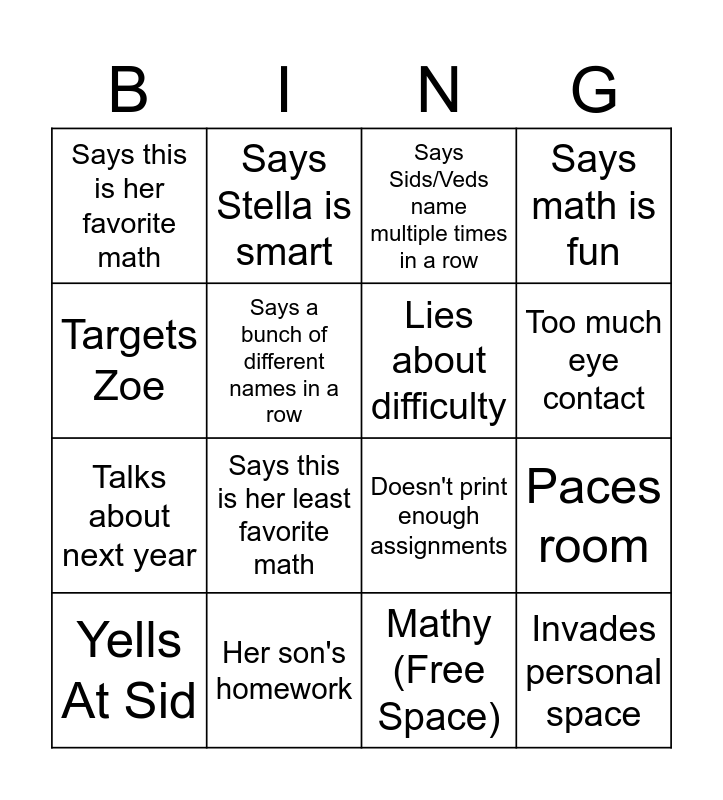 This bingo card has 17 words: Mathy (Free Space), Yells At Sid, Says Sids/Veds name multiple times in a row, Says this is her favorite math, Says this is her least favorite math, Says math is fun, Paces room, Lies about difficulty, Too much eye contact, Says a bunch of different names in a row, Her son's homework, Doesn't print enough assignments, Targets Zoe, Says Stella is smart, Talks about next year, Gives you something for next year and Invades personal space.
