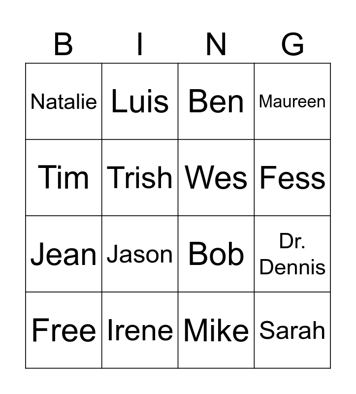 This bingo card has 16 words: Irene, Dr. Dennis, Ben, Natalie, Jean, Luis, Bob, Mike, Tim, Trish, Free, Maureen, Jason, Fess, Wes and Sarah.