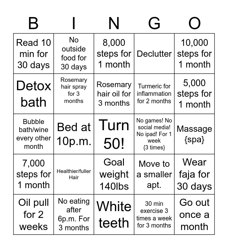 This bingo card has a free space and 24 words: Oil pull for 2 weeks, Healthier/fuller Hair, Rosemary hair oil for 3 months, 30 min exercise 3 times a week for 3 months, 10,000 steps for 1 month, Read 10 min for 30 days, No outside food for 30 days, 8,000 steps for 1 month, No games! No social media! No ipad! For 1 week {3 times}, Massage {spa}, Bubble bath/wine every other month, Rosemary hair spray for 3 months, Move to a smaller apt., Wear faja for 30 days, Detox bath, No eating after 6p.m. For 3 months, White teeth, Declutter, 5,000 steps for 1 month, 7,000 steps for 1 month, Bed at 10p.m., Goal weight 140lbs, Turmeric for inflammation for 2 months and Go out once a month.