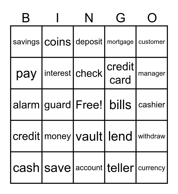 This bingo card has a free space and 24 words: money, save, check, cash, customer, savings, pay, coins, bills, vault, credit card, alarm, lend, withdraw, interest, teller, cashier, deposit, manager, guard, currency, credit, mortgage and account.
