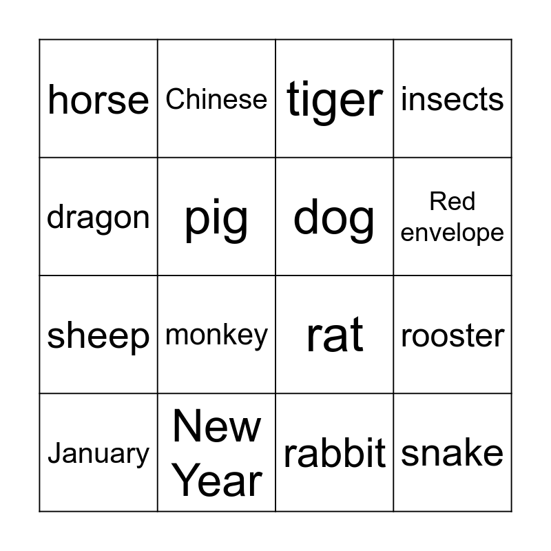 This bingo card has 19 words: rat, ox, tiger, snake, rooster, dragon, rabbit, horse, Chinese, sheep, monkey, pig, dog, New Year, January, Red envelope, insects, Red envelope and hibernate.