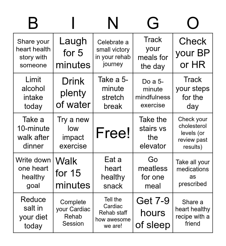 This bingo card has a free space and 24 words: Walk for 15 minutes, Complete your Cardiac Rehab Session, Take a 5-minute stretch break, Reduce salt in your diet today, Check your BP or HR, Share your heart health story with someone, Limit alcohol intake today, Laugh for 5 minutes, Take the stairs vs the elevator, Eat a heart healthy snack, Do a 5-minute mindfulness exercise, Take a 10-minute walk after dinner, Go meatless for one meal, Take all your medications as prescribed, Drink plenty of water, Get 7-9 hours of sleep, Check your cholesterol levels (or review past results), Celebrate a small victory in your rehab journey, Track your steps for the day, Try a new low impact exercise, Share a heart healthy recipe with a friend, Write down one heart healthy goal, Track your meals for the day and Tell the Cardiac Rehab staff how awesome we are!.