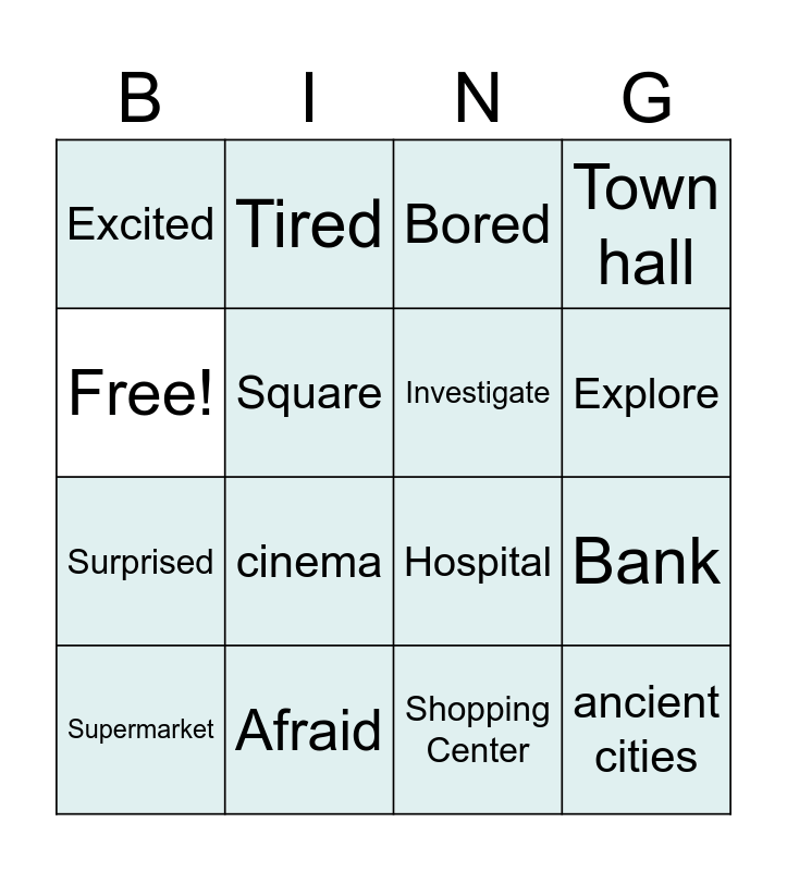 This bingo card has 16 words: Afraid, Bank, Bored, Excited, Surprised, Tired, Hospital, Shopping Center, Free!, Square, Supermarket, Town hall, cinema, Explore, Investigate and ancient cities.