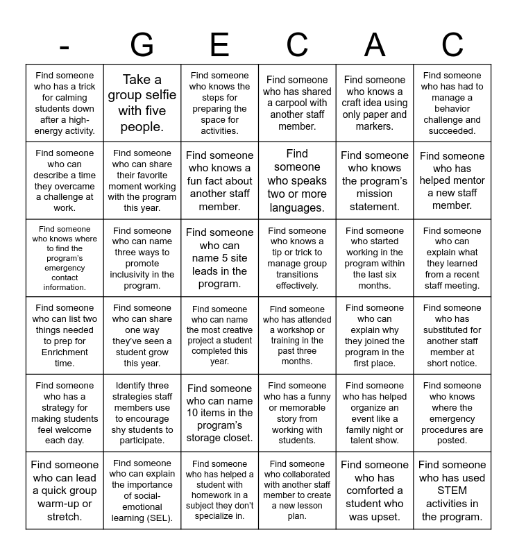 This bingo card has 36 words: Find someone who has a funny or memorable story from working with students., Find someone who can name 10 items in the program’s storage closet., Find someone who collaborated with another staff member to create a new lesson plan., Find someone who can describe a time they overcame a challenge at work., Find someone who can list two things needed to prep for Enrichment time., Find someone who knows a tip or trick to manage group transitions effectively., Find someone who can share their favorite moment working with the program this year., Find someone who has helped a student with homework in a subject they don’t specialize in., Find someone who knows a craft idea using only paper and markers., Find someone who has helped organize an event like a family night or talent show., Find someone who has helped mentor a new staff member., Find someone who has shared a carpool with another staff member., Find someone who knows where the emergency procedures are posted., Find someone who can name three ways to promote inclusivity in the program., Find someone who speaks two or more languages., Find someone who has a trick for calming students down after a high-energy activity., Find someone who has a strategy for making students feel welcome each day., Find someone who started working in the program within the last six months., Find someone who knows where to find the program’s emergency contact information., Find someone who knows the steps for preparing the space for activities., Find someone who can name 5 site leads in the program., Find someone who can share one way they’ve seen a student grow this year., Find someone who has attended a workshop or training in the past three months., Find someone who can name the most creative project a student completed this year., Find someone who can explain why they joined the program in the first place., Take a group selfie with five people., Find someone who knows the program’s mission statement., Find someone who can explain the importance of social-emotional learning (SEL)., Find someone who knows a fun fact about another staff member., Find someone who has had to manage a behavior challenge and succeeded., Find someone who has used STEM activities in the program., Find someone who can lead a quick group warm-up or stretch., Find someone who has substituted for another staff member at short notice., Find someone who can explain what they learned from a recent staff meeting., Identify three strategies staff members use to encourage shy students to participate. and Find someone who has comforted a student who was upset..
