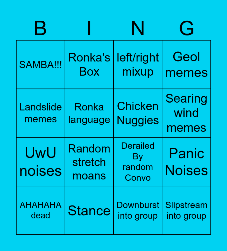This bingo card has 16 words: Stance, Panic Noises, left/right mixup, SAMBA!!!, UwU noises, Ronka's Box, Derailed By random Convo, Downburst into group, Landslide memes, Ronka language, AHAHAHA dead, Geol memes, Random stretch moans, Searing wind memes, Chicken Nuggies and Slipstream into group.
