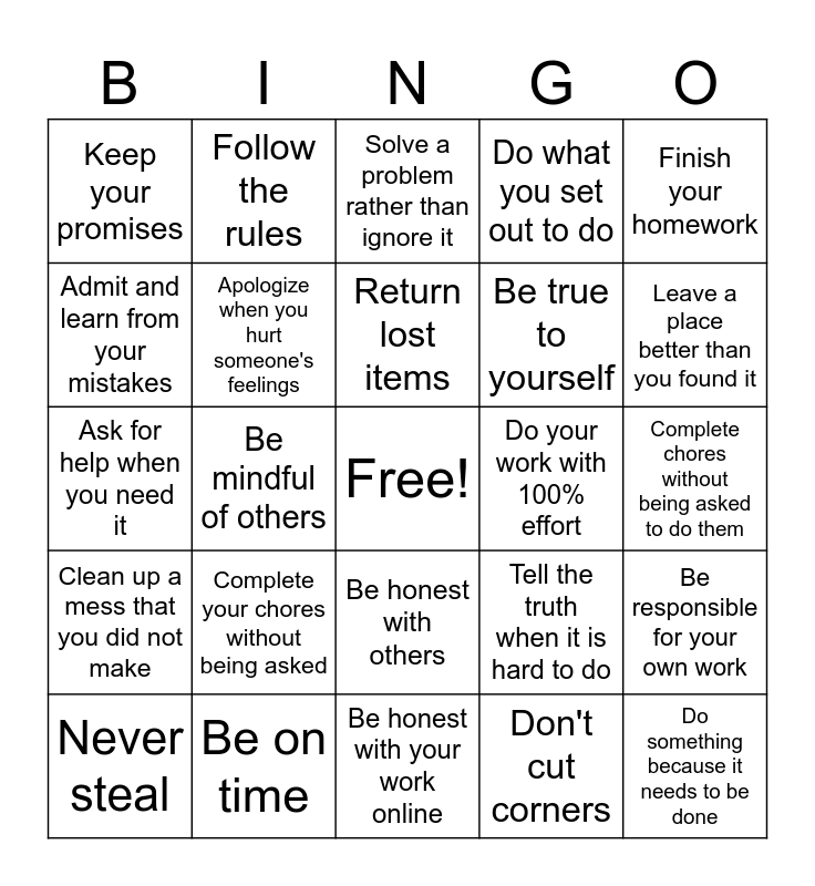 This bingo card has a free space and 24 words: Complete your chores without being asked, Be on time, Return lost items, Never steal, Finish your homework, Keep your promises, Admit and learn from your mistakes, Follow the rules, Do your work with 100% effort, Be honest with others, Be true to yourself, Ask for help when you need it, Tell the truth when it is hard to do, Be responsible for your own work, Apologize when you hurt someone's feelings, Don't cut corners, Complete chores without being asked to do them, Solve a problem rather than ignore it, Leave a place better than you found it, Be mindful of others, Do something because it needs to be done, Clean up a mess that you did not make, Do what you set out to do and Be honest with your work online.