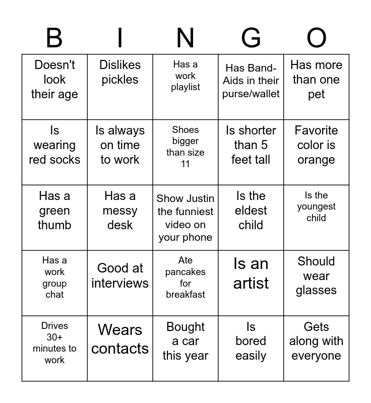 This bingo card has a free space and 29 words: Drives 30+ minutes to work, Grew up where they currently live, Has a messy desk, Is called by the wrong name often, Doesn't look their age, Has a work playlist, Is always on time to work, Good at interviews, Is the eldest child, Wears contacts, Is the youngest child, Gets along with everyone, Bought a car this year, Is bored easily, Favorite color is orange, Same height as you, Ate pancakes for breakfast, Has a work group chat, Has more than one pet, Has a green thumb, Is an artist, Ridden in a helicopter, Is shorter than 5 feet tall, Is wearing red socks, Has Band-Aids in their purse/wallet, Dislikes pickles, Should wear glasses, Shoes bigger than size 11 and Has an accent.