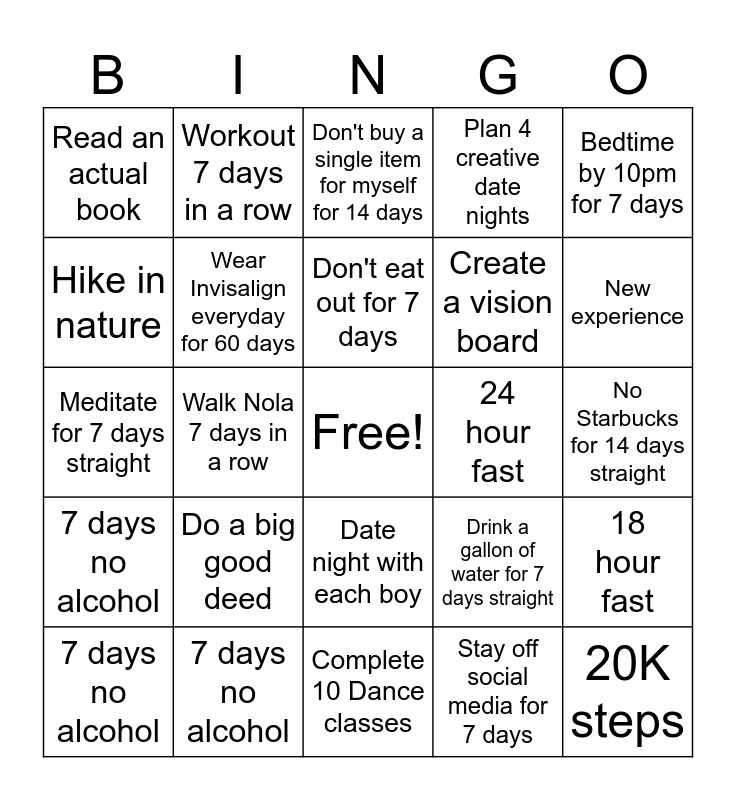 This bingo card has a free space and 24 words: 7 days no alcohol, Do a big good deed, Don't eat out for 7 days, Stay off social media for 7 days, Bedtime by 10pm for 7 days, Read an actual book, Workout 7 days in a row, Don't buy a single item for myself for 14 days, 24 hour fast, No Starbucks for 14 days straight, Meditate for 7 days straight, Wear Invisalign everyday for 60 days, Drink a gallon of water for 7 days straight, 18 hour fast, Hike in nature, 7 days no alcohol, Complete 10 Dance classes, Plan 4 creative date nights, New experience, 7 days no alcohol, Walk Nola 7 days in a row, Date night with each boy, Create a vision board and 20K steps.