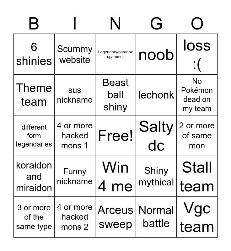 This bingo card has a free space and 24 words: Funny nickname, 4 or more hacked mons 2, Beast ball shiny, 3 or more of the same type, loss :(, 6 shinies, Theme team, Scummy website, Salty dc, Win 4 me, lechonk, different form legendaries, Shiny mythical, Stall team, sus nickname, Normal battle, 2 or more of same mon, Legendary/paradox spammer, No Pokémon dead on my team, 4 or more hacked mons 1, Vgc team, koraidon and miraidon, noob and Arceus sweep.