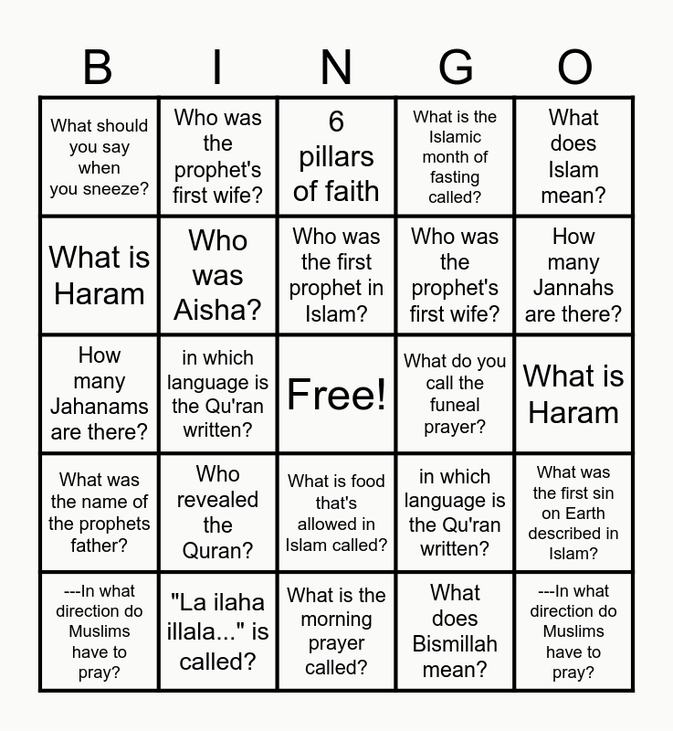 This bingo card has a free space and 34 words: 5 pillars of islam, What does Bismillah mean?, Who was the first man created?, who was the last prophet?, What was the name of the prophets father?, Who was Aisha?, What does Islam mean?, ---In what direction do Muslims have to pray?, Who was the prophet's first wife?, What was the name of the prophets mother?, Who was the first prophet in Islam?, 6 pillars of faith, How many names does Allah have?, Who was the last prophet?, What do you call the funeal prayer?, How many Jannahs are there?, "La ilaha illala..." is called?, How many Jahanams are there?, Who revealed the Quran?, in which language is the Qu'ran written?, What is food that's allowed in Islam called?, How many letters are there in the Arabic alphabet?, What should you say when you sneeze?, What is Haram, What is the morning prayer called?, ---In what direction do Muslims have to pray?, What is the Islamic month of fasting called?, What is the last prayer called?, Who was the prophet's first wife?, What is Haram, -What do Muslims believe that Jesus was?, in which language is the Qu'ran written?, What was the first sin on Earth described in Islam? and What do all Muslims have to do before prayer?.