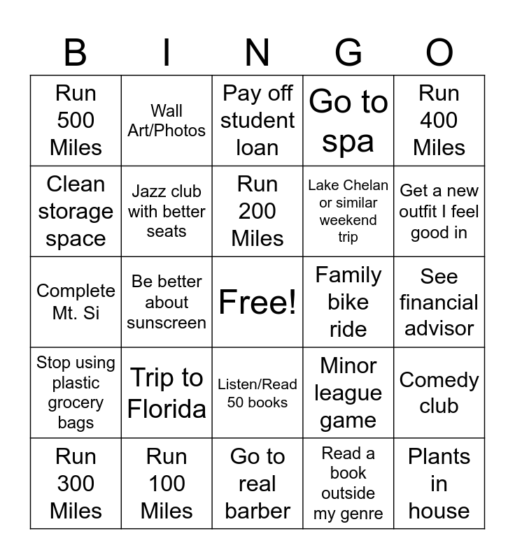 This bingo card has a free space and 24 words: Trip to Florida, Run 100 Miles, Run 200 Miles, Run 300 Miles, Run 400 Miles, Run 500 Miles, Clean storage space, Wall Art/Photos, Family bike ride, Listen/Read 50 books, Lake Chelan or similar weekend trip, Complete Mt. Si, Minor league game, Comedy club, Jazz club with better seats, Read a book outside my genre, See financial advisor, Pay off student loan, Get a new outfit I feel good in, Be better about sunscreen, Plants in house, Stop using plastic grocery bags, Go to spa and Go to real barber.