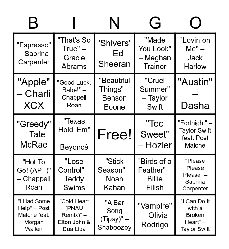 This bingo card has a free space and 25 words: "Lose Control" – Teddy Swims, "A Bar Song (Tipsy)" – Shaboozey, "Beautiful Things" – Benson Boone, "I Had Some Help" – Post Malone feat. Morgan Wallen, "Lovin on Me" – Jack Harlow, "Espresso" – Sabrina Carpenter, "Apple" – Charli XCX, "That's So True" – Gracie Abrams, "Too Sweet" – Hozier, "Stick Season" – Noah Kahan, "Cruel Summer" – Taylor Swift, "Greedy" – Tate McRae, "Birds of a Feather" – Billie Eilish, "Please Please Please" – Sabrina Carpenter, "Good Luck, Babe!" – Chappell Roan, "Feather" – Sabrina Carpenter, "Fortnight" – Taylor Swift feat. Post Malone, "Shivers" – Ed Sheeran, "Austin" – Dasha, "Texas Hold 'Em" – Beyoncé, "I Can Do It with a Broken Heart" – Taylor Swift, "Cold Heart (PNAU Remix)" – Elton John & Dua Lipa, "Hot To Go! (APT)" – Chappell Roan, "Made You Look" – Meghan Trainor and "Vampire" – Olivia Rodrigo.