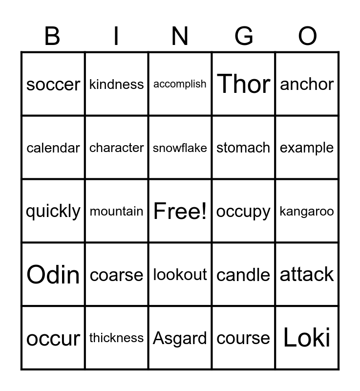 This bingo card has a free space and 24 words: coarse, thickness, snowflake, occur, anchor, soccer, calendar, kindness, occupy, lookout, stomach, quickly, candle, attack, character, course, kangaroo, accomplish, example, mountain, Loki, Odin, Thor and Asgard.