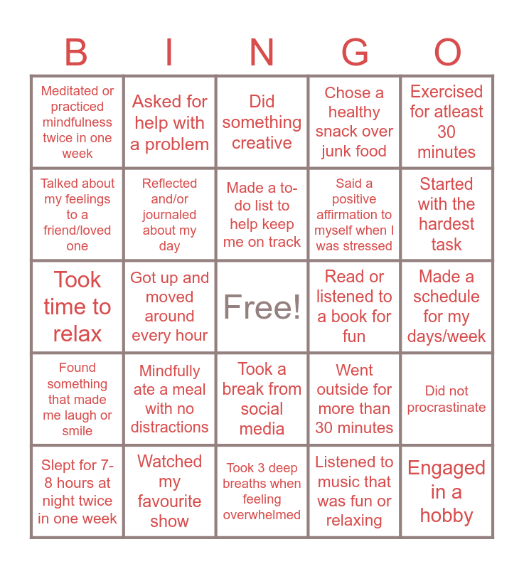 This bingo card has a free space and 24 words: Slept for 7-8 hours at night twice in one week, Mindfully ate a meal with no distractions, Made a to-do list to help keep me on track, Listened to music that was fun or relaxing, Exercised for atleast 30 minutes, Meditated or practiced mindfulness twice in one week, Asked for help with a problem, Did something creative, Read or listened to a book for fun, Made a schedule for my days/week, Took time to relax, Reflected and/or journaled about my day, Went outside for more than 30 minutes, Did not procrastinate, Talked about my feelings to a friend/loved one, Watched my favourite show, Took 3 deep breaths when feeling overwhelmed, Chose a healthy snack over junk food, Started with the hardest task, Found something that made me laugh or smile, Got up and moved around every hour, Took a break from social media, Said a positive affirmation to myself when I was stressed and Engaged in a hobby.