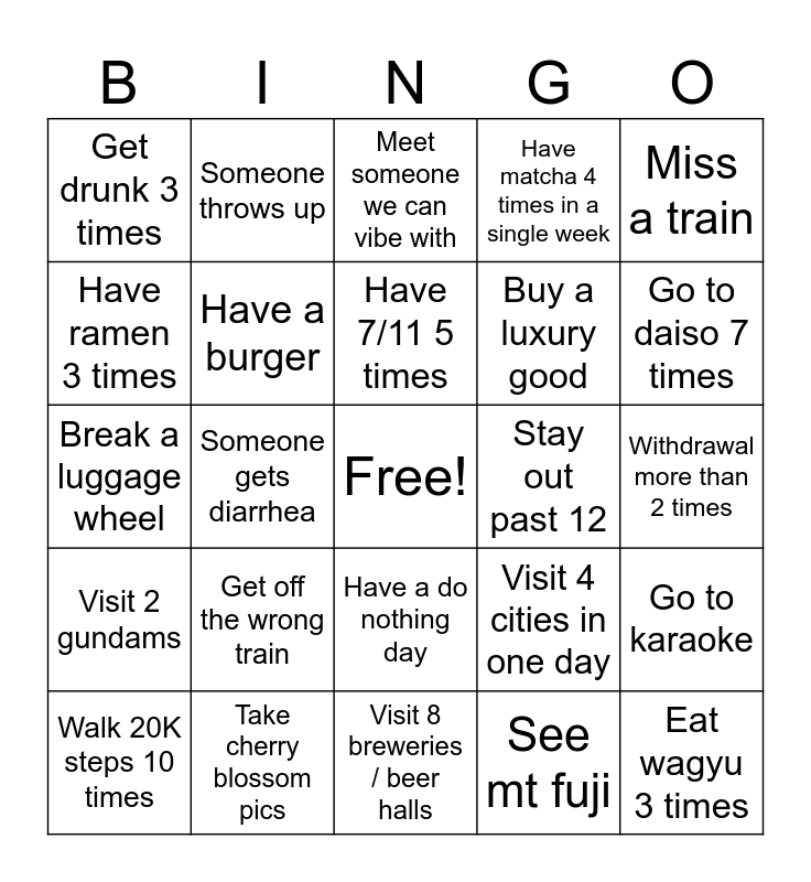 This bingo card has a free space and 24 words: Get off the wrong train, Take cherry blossom pics, Have 7/11 5 times, Walk 20K steps 10 times, Miss a train, Get drunk 3 times, Have ramen 3 times, Someone throws up, Stay out past 12, Have a do nothing day, Buy a luxury good, Break a luggage wheel, Visit 4 cities in one day, Go to karaoke, Have a burger, See mt fuji, Withdrawal more than 2 times, Meet someone we can vibe with, Go to daiso 7 times, Someone gets diarrhea, Eat wagyu 3 times, Visit 2 gundams, Have matcha 4 times in a single week and Visit 8 breweries / beer halls.