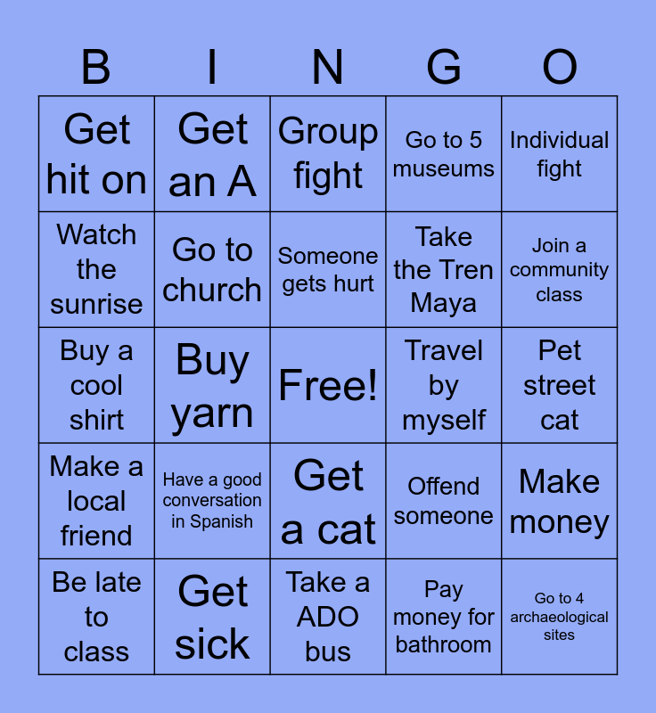 This bingo card has a free space and 24 words: Have a good conversation in Spanish, Get sick, Someone gets hurt, Be late to class, Individual fight, Get hit on, Watch the sunrise, Get an A, Travel by myself, Get a cat, Take the Tren Maya, Buy a cool shirt, Offend someone, Make money, Go to church, Pay money for bathroom, Pet street cat, Group fight, Join a community class, Buy yarn, Go to 4 archaeological sites, Make a local friend, Go to 5 museums and Take a ADO bus.