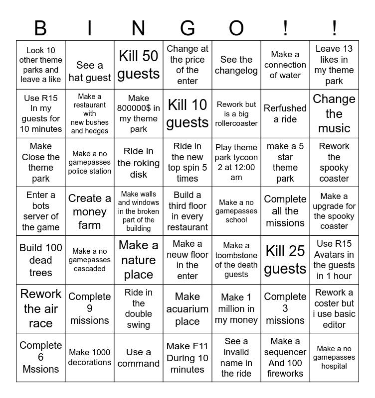 This bingo card has 49 words: Complete 3 missions, Rerfushed a ride, See a invalid name in the ride, Create a money farm, Ride in the roking disk, Make a upgrade for the spooky coaster, See a hat guest, Use a command, Make a connection of water, Make a neuw floor in the enter, Leave 13 likes in my theme park, Change at the price of the enter, make a 5 star theme park, Play theme park tycoon 2 at 12:00 am, Complete 9 missions, Complete all the missions, Use R15 In my guests for 10 minutes, Change the music, Rework a coster but i use basic editor, See the changelog, Rework but is a big rollercoaster, Make walls and windows in the broken part of the building, Look 10 other theme parks and leave a like, Make a restaurant with new bushes and hedges, Complete 6 Mssions, Make 800000$ in my theme park, Rework the spooky coaster, Make 1000 decorations, Ride in the new top spin 5 times, Make a no gamepasses police station, Make a no gamepasses hospital, Make a no gamepasses school, Rework the air race, Ride in the double swing, Enter a bots server of the game, Make a toombstone of the death guests, Kill 25 guests, Use R15 Avatars in the guests in 1 hour, Make Close the theme park, Make a nature place, Make acuarium place, Build 100 dead trees, Build a third floor in every restaurant, Make F11 During 10 minutes, Kill 10 guests, Kill 50 guests, Make 1 million in my money, Make a no gamepasses cascaded and Make a sequencer And 100 fireworks.