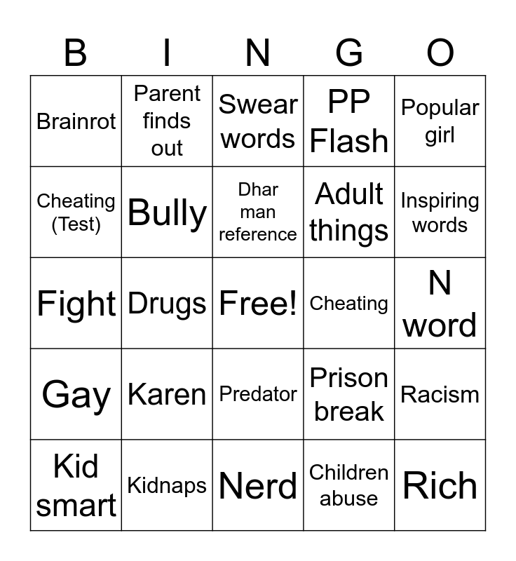 This bingo card has a free space and 24 words: Karen, Kidnaps, Dhar man reference, Kid smart, Popular girl, Brainrot, Cheating (Test), Parent finds out, Cheating, Predator, Adult things, Fight, Prison break, Racism, Bully, Children abuse, N word, Swear words, Inspiring words, Drugs, Rich, Gay, PP Flash and Nerd.