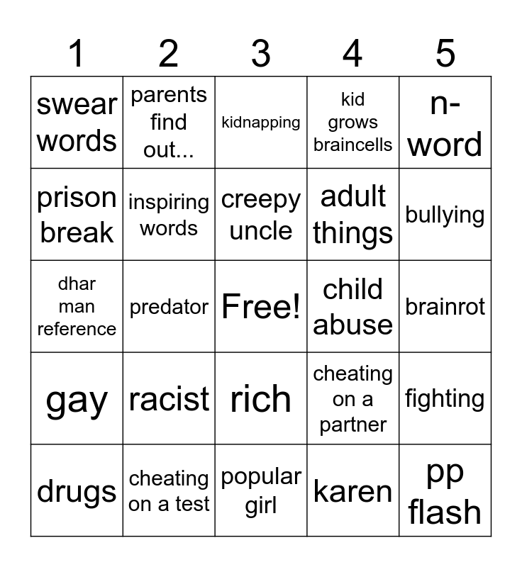 This bingo card has a free space and 24 words: racist, cheating on a test, creepy uncle, drugs, n-word, swear words, prison break, parents find out..., child abuse, rich, adult things, dhar man reference, cheating on a partner, fighting, inspiring words, karen, brainrot, kidnapping, bullying, predator, pp flash, gay, kid grows braincells and popular girl.