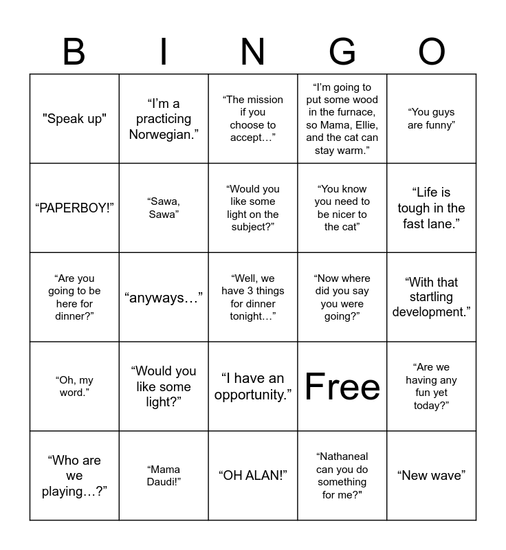 This bingo card has 25 words: “Would you like some light?”, “OH ALAN!”, “Would you like some light on the subject?”, “Who are we playing…?”, “You guys are funny”, "Speak up", “PAPERBOY!”, “I’m a practicing Norwegian.”, “Now where did you say you were going?”, “I have an opportunity.”, “You know you need to be nicer to the cat”, “Are you going to be here for dinner?”, Free, “Are we having any fun yet today?”, “Sawa, Sawa”, “New wave”, “With that startling development.”, “The mission if you choose to accept…”, “Life is tough in the fast lane.”, “anyways…”, “Well, we have 3 things for dinner tonight…”, “Mama Daudi!”, “Oh, my word.”, “I’m going to put some wood in the furnace, so Mama, Ellie, and the cat can stay warm.” and “Nathaneal can you do something for me?".