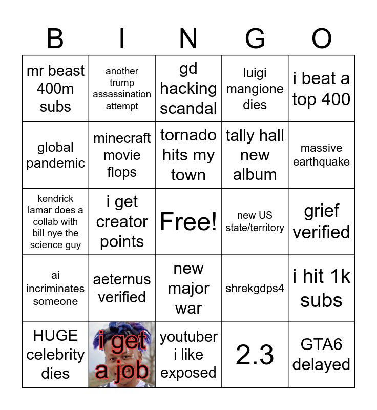 This bingo card has 1 images, a free space and 24 words: aeternus verified, i get a job, tornado hits my town, HUGE celebrity dies, i beat a top 400, mr beast 400m subs, global pandemic, another trump assassination attempt, new US state/territory, new major war, tally hall new album, kendrick lamar does a collab with bill nye the science guy, shrekgdps4, i hit 1k subs, minecraft movie flops, 2.3, grief verified, gd hacking scandal, massive earthquake, i get creator points, GTA6 delayed, ai incriminates someone, luigi mangione dies and youtuber i like exposed.