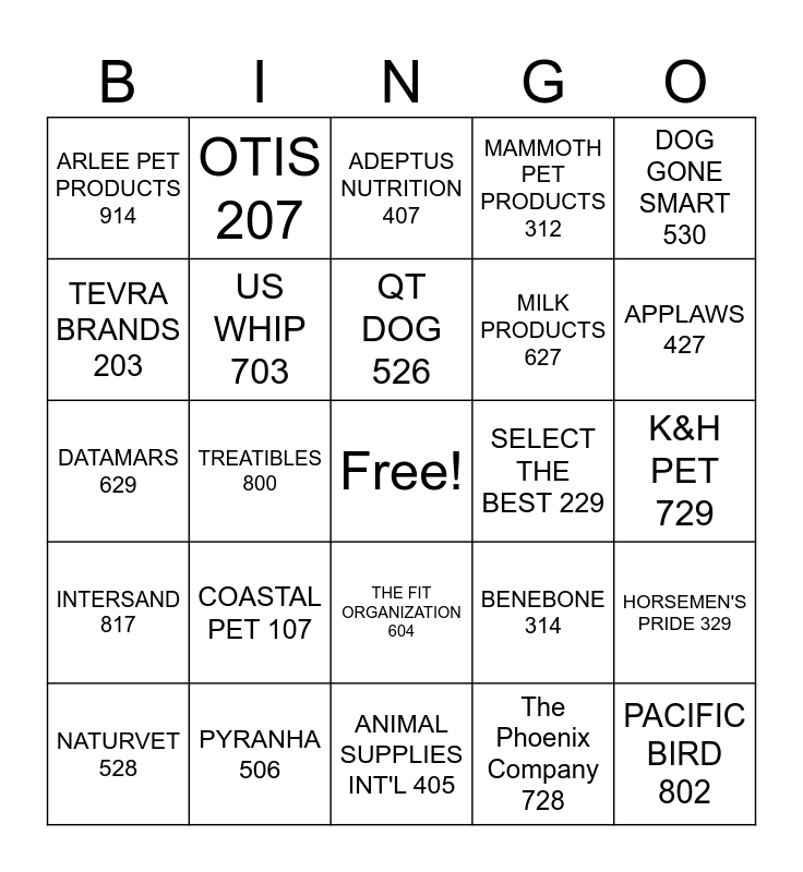 This bingo card has a free space and 24 words: COASTAL PET 107, PYRANHA 506, QT DOG 526, NATURVET 528, DOG GONE SMART 530, ARLEE PET PRODUCTS 914, TEVRA BRANDS 203, OTIS 207, SELECT THE BEST 229, THE FIT ORGANIZATION 604, MILK PRODUCTS 627, DATAMARS 629, BENEBONE 314, HORSEMEN'S PRIDE 329, US WHIP 703, The Phoenix Company 728, K&H PET 729, ADEPTUS NUTRITION 407, APPLAWS 427, TREATIBLES 800, PACIFIC BIRD 802, INTERSAND 817, MAMMOTH PET PRODUCTS 312 and ANIMAL SUPPLIES INT'L 405.