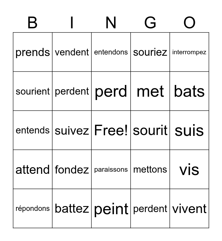 This bingo card has a free space and 34 words: rend, perdent, mord, réponds, attend, perdent, interrompez, répondons, vendent, descendez, perd, entendons, vends, défend, sourit, bats, battez, entends, fondez, mettons, paraissons, peignons, prends, suis, peint, vivent, souriez, fond, met, sourient, paraît, suivez, vis and entendent.