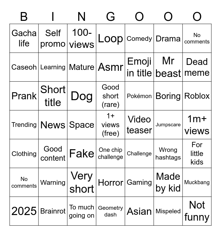 This bingo card has a free space and 52 words: No comments, Good content, Minecraft, Geometry dash, Emoji in title, Wrong hashtags, No comments, No title, Short title, Very short, Loop, Video teaser, Mr beast, 1m+ views, Trending, Brainrot, 100- views, Asmr, Gaming, Drama, Roblox, Caseoh, Self promo, Mature, Asian, Boring, For little kids, 2025, News, Fake, Fortnite, Comedy, Mispeled, Not funny, Prank, Learning, Space, One chip challenge, Challenge, Made by kid, Muckbang, Gacha life, Warning, To much going on, Good short (rare), Pokémon, Jumpscare, Dead meme, Clothing, Cat, Dog and Horror.