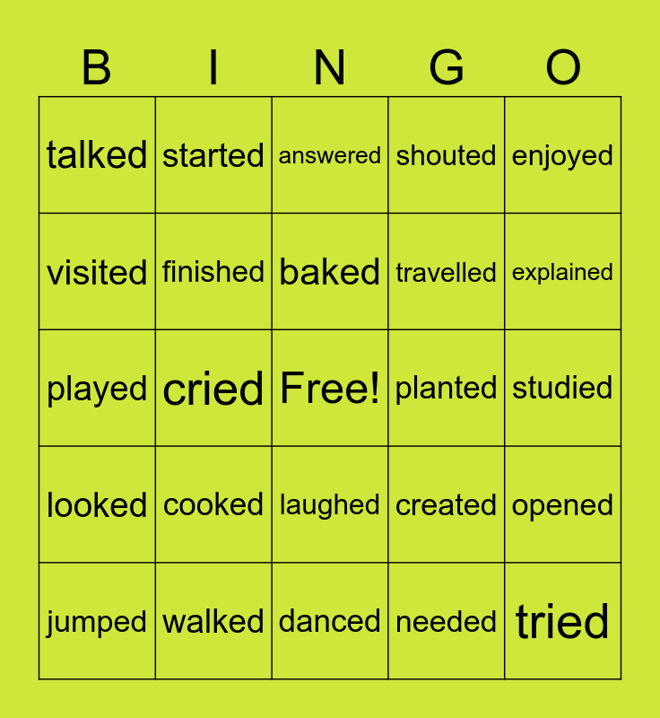 This bingo card has a free space and 24 words: jumped, cooked, baked, needed, enjoyed, talked, started, answered, planted, studied, played, finished, created, opened, visited, walked, danced, shouted, explained, looked, cried, laughed, travelled and tried.