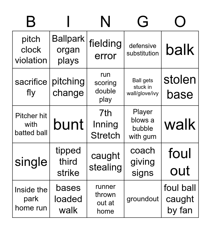 This bingo card has a free space and 56 words: Player loses hat/helmet/shoe, Inside the park home run, throwing error, pitch clock violation, runner thrown out at home, Sliding or diving catch, pitching change, pinch runner, Ball gets stuck in wall/glove/ivy, pinch hitter, defensive substitution, hit by pitch, swinging strike out, strikeout looking, Ground rule double, double play, balk, bunt, flyout, foul ball caught by fan, Player blows a bubble with gum, Home run into water, coach giving signs, fielding error, bases loaded, run scoring double play, Player curses loud enough to hear, full count, stolen base, rundown/pickle, triple, three run home run, Barehanded play, two run home run, walk, sacrifice fly, Pitcher hit with batted ball, Coach ejected, single, Ballpark organ plays, caught stealing, Pick off, Replay review, Player ejected, homerun, tipped third strike, bases loaded walk, hit on an 0-2 count, runners on the corners, double, groundout, Fight/Someone throws a punch, two run single, three run double or triple, foul out and grand slam.