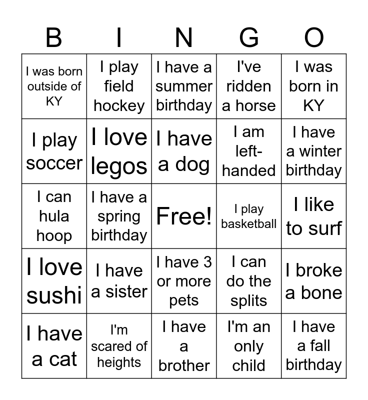 This bingo card has a free space and 25 words: I have a sister, I have a brother, I have a dog, I have a cat, I was born in KY, I was born outside of KY, I play soccer, I play field hockey, I play basketball, I have 3 or more pets, I am left-handed, I can hula hoop, I can do the splits, I broke a bone, I love legos, I've been on a plane, I like to surf, I have a summer birthday, I have a winter birthday, I have a spring birthday, I have a fall birthday, I'm scared of heights, I love sushi, I've ridden a horse and I'm an only child.
