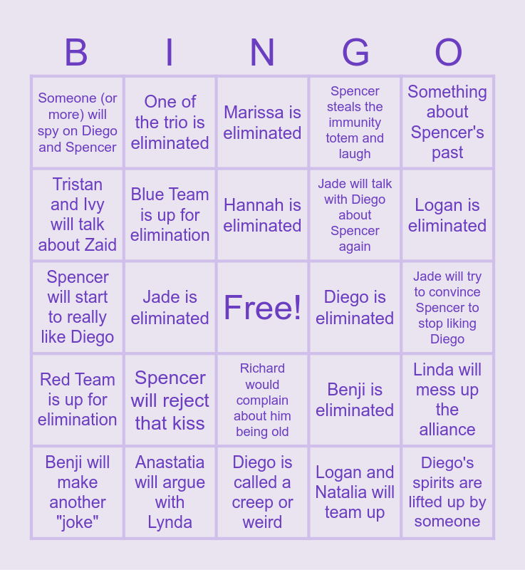 This bingo card has a free space and 24 words: Spencer will reject that kiss, Anastatia will argue with Lynda, Hannah is eliminated, Benji will make another "joke", Something about Spencer's past, Someone (or more) will spy on Diego and Spencer, Tristan and Ivy will talk about Zaid, One of the trio is eliminated, Diego is eliminated, Richard would complain about him being old, Jade will talk with Diego about Spencer again, Spencer will start to really like Diego, Benji is eliminated, Linda will mess up the alliance, Blue Team is up for elimination, Logan and Natalia will team up, Jade will try to convince Spencer to stop liking Diego, Marissa is eliminated, Logan is eliminated, Jade is eliminated, Diego's spirits are lifted up by someone, Red Team is up for elimination, Spencer steals the immunity totem and laugh and Diego is called a creep or weird.