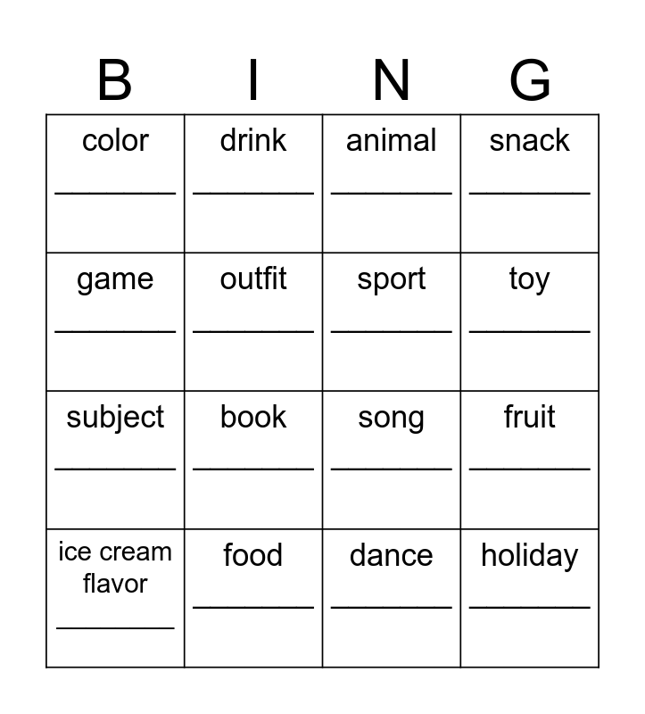This bingo card has 16 words: food _______, fruit _______, animal _______, color _______, subject _______, drink _______, song _______, dance _______, game _______, outfit _______, ice cream flavor ________, snack _______, book _______, toy _______, sport _______ and holiday _______.
