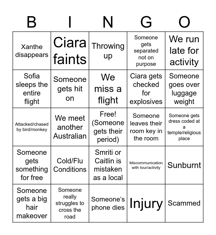 This bingo card has a free space and 42 words: Someone loses something valuable, We miss a flight, Stomach issues, Cold/Flu Conditions, Injury, Sunburnt, Scammed, Vegetarian accidentally/purposefully consumes meat, Throwing up, Smriti or Caitlin is mistaken as a local, Someone gets dress coded at a temple/religious place, Someone goes over luggage weight, We meet another Australian, We run late for activity, ayeh gets a burnt/sunscreen rash and complains a lot, Miscommunication with tour/activity, Someone gets a tattoo/piercing, Attacked/chased by bird/monkey, Tourist asks if they can get a photo with a member of our group, Ciara faints, Sofia sleeps the entire flight, Charlotte drinks 5 coffees in a day, Someone gets pick pocketed, Xanthe disappears, Bad turbulence, Annabelle gets thrown up on, Ciara gets checked for explosives, Someone is yelled at security, Ayeh or Ciara gets random checked, Two people plus cry, Smriti yells at someone, Someone gets something for free, Someone gets hit on, Someone’s phone dies, Someone’s parent freaks out, Someone gets a big hair makeover, Someone really struggles to cross the road, Someone leaves their room key in the room, We break something that isn’t ours, Caitlin trips, Someone gets separated not on purpose and Someone gets sick after a ride.