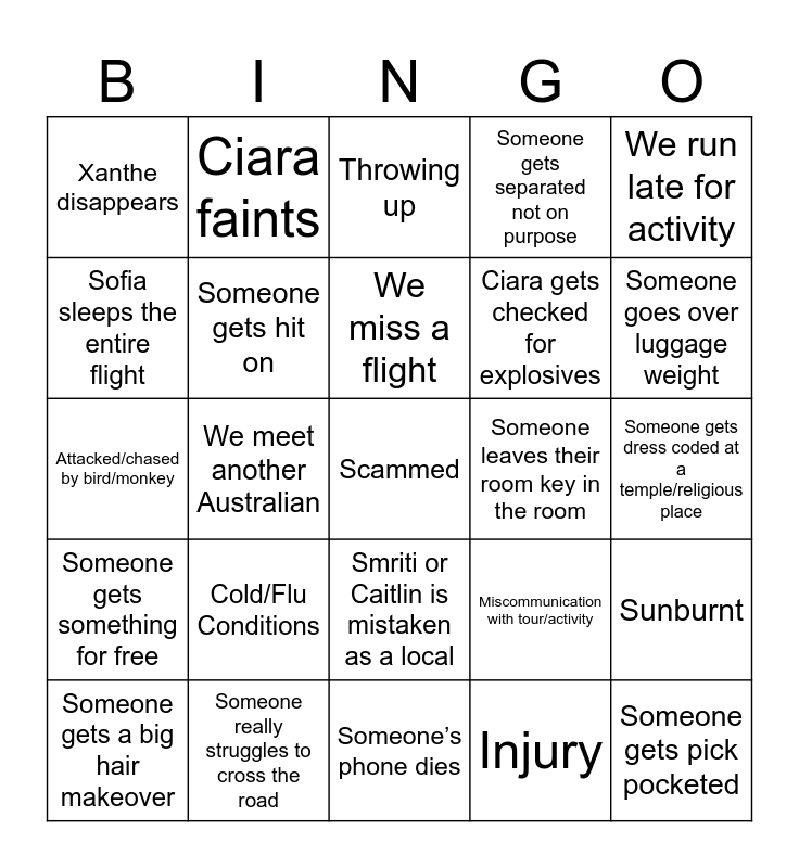 This bingo card has 42 words: Someone loses something valuable, We miss a flight, Stomach issues, Cold/Flu Conditions, Injury, Sunburnt, Scammed, Vegetarian accidentally/purposefully consumes meat, Throwing up, Smriti or Caitlin is mistaken as a local, Someone gets dress coded at a temple/religious place, Someone goes over luggage weight, We meet another Australian, We run late for activity, ayeh gets a burnt/sunscreen rash and complains a lot, Miscommunication with tour/activity, Someone gets a tattoo/piercing, Attacked/chased by bird/monkey, Tourist asks if they can get a photo with a member of our group, Ciara faints, Sofia sleeps the entire flight, Charlotte drinks 5 coffees in a day, Someone gets pick pocketed, Xanthe disappears, Bad turbulence, Annabelle gets thrown up on, Ciara gets checked for explosives, Someone is yelled at security, Ayeh or Ciara gets random checked, Two people plus cry, Smriti yells at someone, Someone gets something for free, Someone gets hit on, Someone’s phone dies, Someone’s parent freaks out, Someone gets a big hair makeover, Someone really struggles to cross the road, Someone leaves their room key in the room, We break something that isn’t ours, Caitlin trips, Someone gets separated not on purpose and Someone gets sick after a ride.