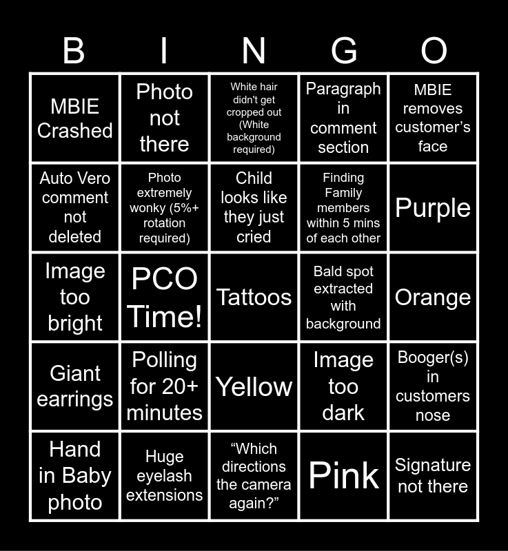 This bingo card has 29 words: Hand in Baby photo, Blurry Photo, PCO Time!, Signature not there, MBIE Crashed, White hair didn't get cropped out (White background required), Photo extremely wonky (5%+ rotation required), Polling for 20+ minutes, Bald spot extracted with background, Huge eyelash extensions, Orange, Tattoos, “Which directions the camera again?”, Pink, Purple, Shadows in photo, Yellow, Giant earrings, MBIE removes customer’s face, Image too bright, Image too dark, Stain on shirt, Finding Family members within 5 mins of each other, Auto Vero comment not deleted, Paragraph in comment section, Photo not there, Booger(s) in customers nose, Child looks like they just cried and Little girl looks ready for murder.