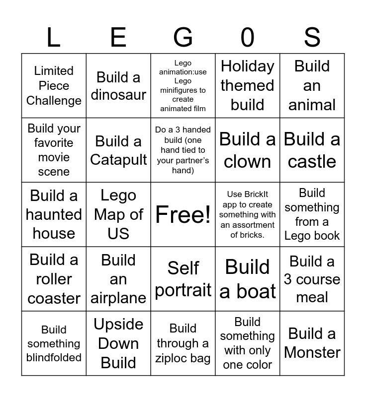 This bingo card has a free space and 30 words: Upside Down Build, Build a Pyramid, Lego Map of US, Marble Maze, Limited Piece Challenge, Lego animation:use Lego minifigures to create animated film, Build a Catapult, Self portrait, Use BrickIt app to create something with an assortment of bricks., Build through a ziploc bag, Build something from a Lego book, Build a Monster, Build something with only one color, Build a theme park, Build a castle, Build a robot, Build a boat, Build a roller coaster, Build an airplane, Build an animal, Build a haunted house, Build a person, Build a dinosaur, Build a clown, Build your favorite movie scene, Holiday themed build, Build a 3 course meal, Build something blindfolded, Do a 3 handed build (one hand tied to your partner’s hand) and Build a room in your house.